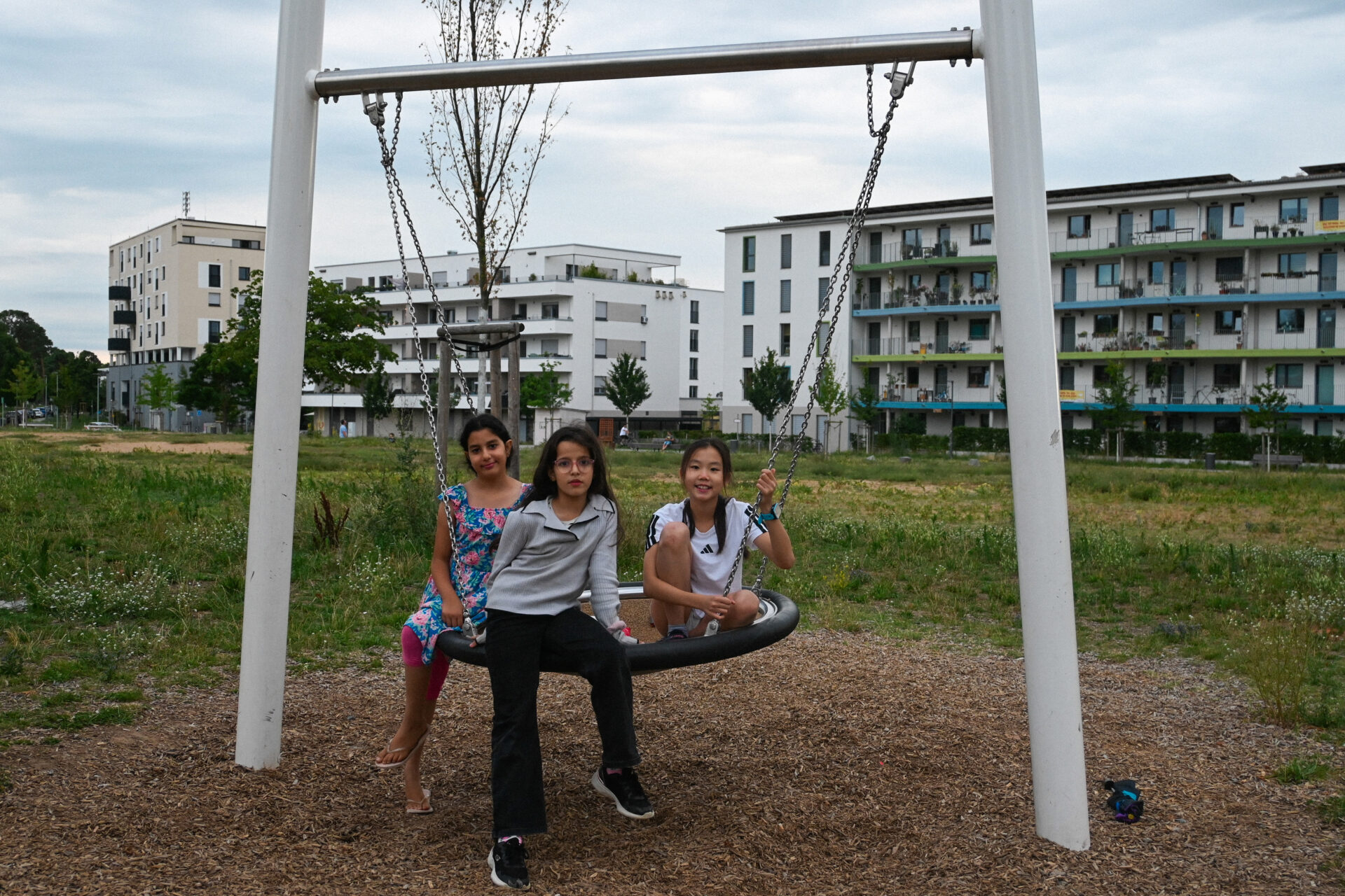 Ein zentrales Element der Siedlung ist der Quartierspark, der als grüne Mitte fungiert. Dort gibt es neben einer Wiese mit geschützten Pflanzenarten auch Freizeitmöglichkeiten wie einen inklusiven Spielplatz. Die zwölfjährige Eleni, die mit ihren beiden Freundinnen Ada und Talia (Namen geändert) gerne am Spielplatz abhängt, sagt: »Meine Familie und ich fühlen uns hier sehr wohl. Zur Schule ist es nicht weit und auch alle meine Freunde leben hier.« Die drei kichern und fotografieren sich gegenseitig.